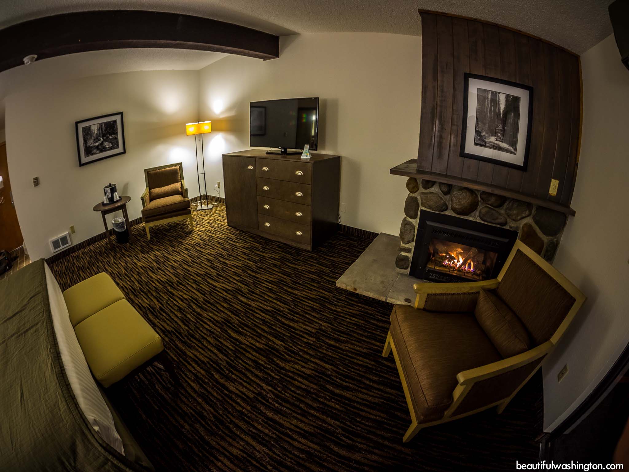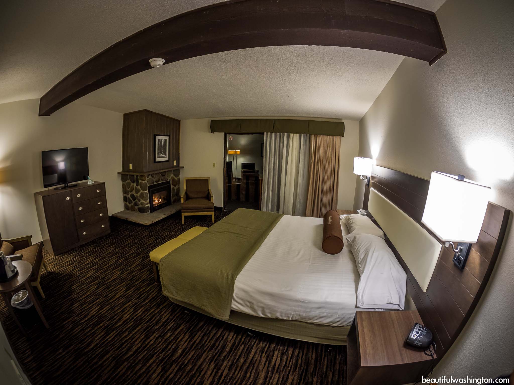 Lake Quinault Lodge offers to choose among different kinds of rooms. Here you will find a charming Fireplace Room which includes a king size bed, a gas fireplace, and a private balcony or patio. There are no televisions in the Fireplace Rooms and all the rooms are non-smoking.